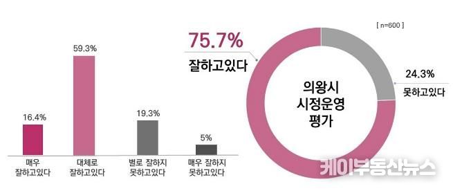 케이부동산뉴스 김교민 기자 | 의왕시민 10명 중 7명 이상(75.7%)이 민선8기 의왕시 시정운영을 긍정적으로 평가하는 것으로 나타났다.