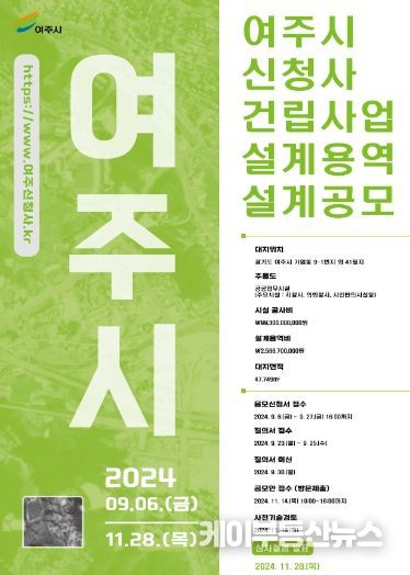 참가 등록은 여주시 신청사 건립 설계 공모 홈페이지를 통하여 9월 6일부터 9월 27일 16:00까지이며, 11월 14일 공모안을 접수하여 작품심사를 거쳐 2024년 11월 28일 여주시 홈페이지와 세움터를 통하여 최종 당선작을 발표할 예정이다.