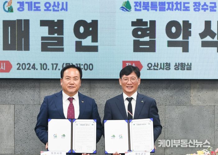 케이부동산뉴스 김교민 기자 | 경기도 오산시와 전북특별자치도 장수군이 17일 오전 오산시청 상황실에서 자매결연 협약식을 맺고 상생발전 및 공동발전 협력 강화에 나서기로 했다.