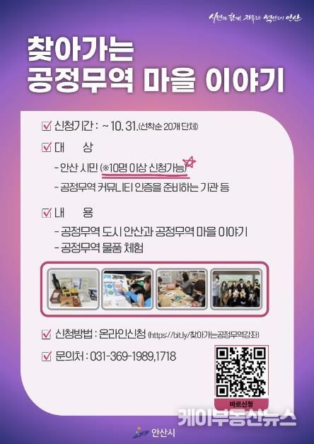 케이부동산뉴스 김교민 기자 | 안산시는 공정무역 실천도시 안산을 위한 공정무역 인식확산 강좌 ‘찾아가는 공정무역 마을이야기’의 참가자를 모집한다고 21일 밝혔다.