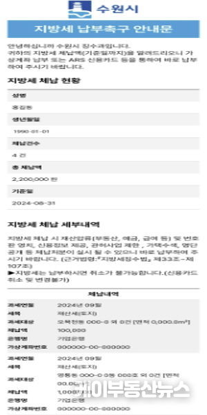 케이부동산뉴스 김교민 기자 | 수원시가 ‘모바일 전자고지 시스템’을 활용해 지방세·세외수입 체납자에게 전자문서 형태로 체납안내문을 발송한다.