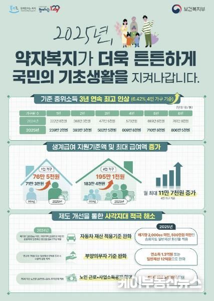 2025년 기준중위소득은 맞춤형 급여체제로 전환된 2015년 이후 역대 최대 증가율을 보였다. 4인 가구 기준으로 지난해 572만 9913원 대비 6.42% 인상된 609만 7,773원, 생계·의료·주거·교육 급여를 포함한 전체 수급가구의 약 74%를 차지하는 1인 가구 기준은 작년 222만 8,445원 대비 7.34% 인상된 239만 2,013원으로 결정됐다.