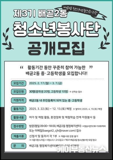 케이부동산뉴스 김교민 기자 | 시흥시 배곧2동 청소년지도협의회는 자원봉사 및 다양한 체험 활동을 함께할 제3기 배곧2동 청소년봉사단원을 3월 7일까지 모집한다.