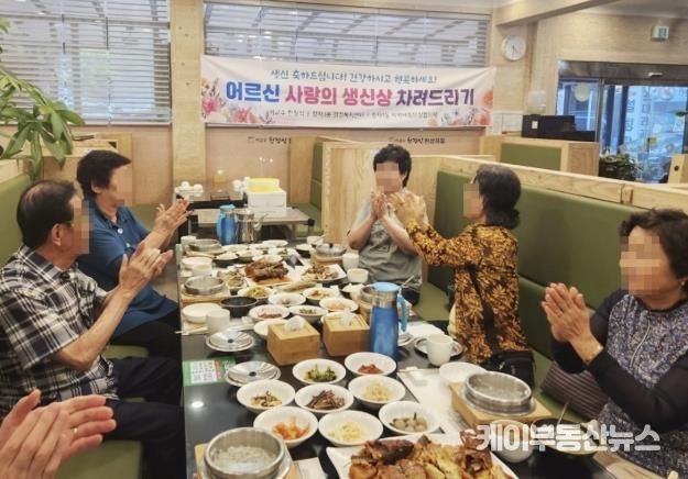 케이부동산뉴스 김교민 기자 | 수원시 장안구 정자1동과 정자1동 지역사회보장협의체는 지난 14일, ‘이교수한정식’에서 홀몸 어르신들에게 사랑의 생신상을 대접했다. 정자1동은 지난 2월, 인계동 소재 ‘이교수한정식’ 식당과 ‘지역 복지 발전과 건강하고 따뜻한 도시 조성을 위한 업무협약’을 체결한 이래 꾸준히 사랑의 생신상을 대접하고 있다.
