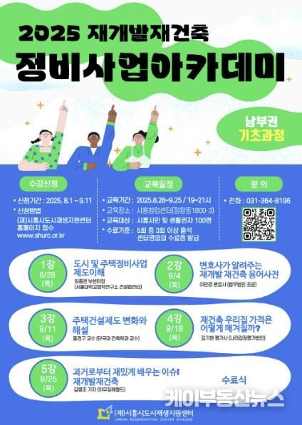 케이부동산뉴스 김교민 기자 | 시흥시와 (재)시흥시도시재생지원센터는 ‘2025 시흥시 정비사업 아카데미ㆍ북부권’을 마치고, 오는 8월 28일부터 ‘남부권 기초과정’을 개설한다.