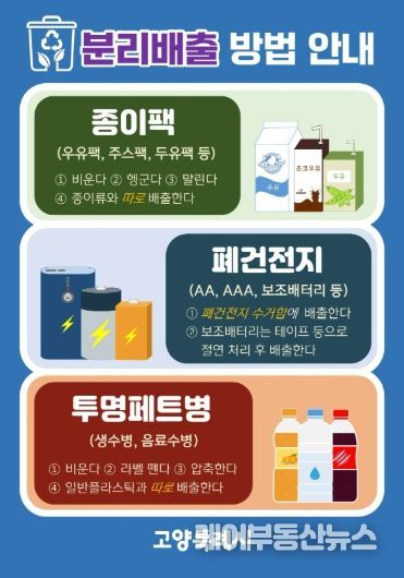 케이부동산뉴스 김교민 기자 | 고양특례시는 시민들에게 3대 재활용품(폐건전지·종이팩·투명페트병)을 반드시 분리 배출해 줄 것을 당부했다.