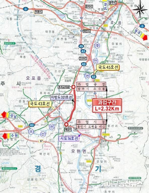 케이부동산뉴스 김교민 기자 | 용인시 처인구 모현읍 매산리와 광주시 추자동을 연결하는 ‘지방도321호선 매산~일산간 도로 확포장공사’가 완료돼 25일 낮 12시부터 공식 개통한다.