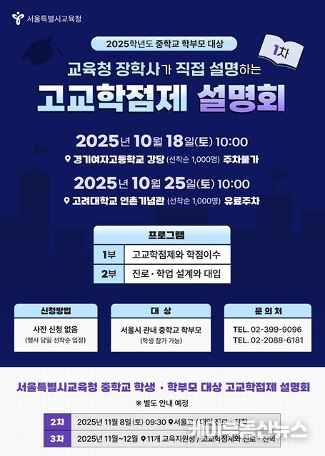 이번 10월 설명회 1부에서는 서울시교육청 고교학점제 업무 담당 장학사가 △고교학점제의 이해와 학점 이수 제도에 대해 설명하고, 2부에서는 △진로·학업 설계와 대입 준비 등에 대해 안내한다.