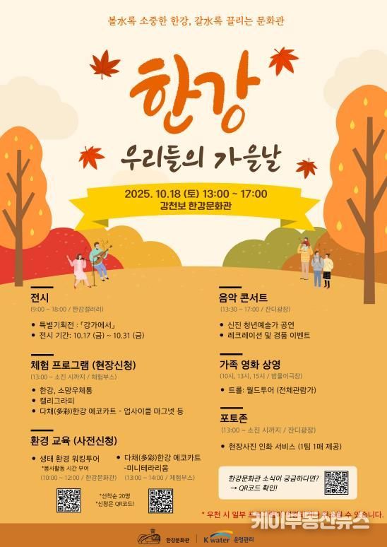 케이부동산뉴스 김교민 기자 | K-water한강보관리단과 케이워터운영관리 한강문화관은 오는 10월 18일 가족과 이웃이 함께 즐기는 대표 문화축제 “한강, 우리들의 가을날”를 개최한다고 밝혔다