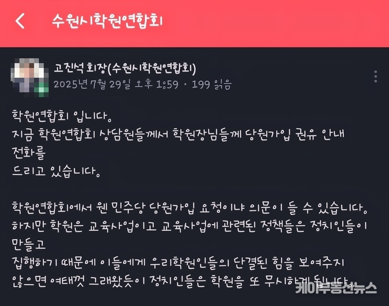 케이부동산뉴스 김교민 기자 | 수원시 지역 학원장들로 구성된 수원시학원연합회(회장 고진석)가 특정 정당인 더불어민주당 당원 가입을 “학원장 출신을 내년 지방선거에 출마시켜 당선자를 배출하기 위한 사업”으로 규정하고, 회원들에게 ‘민주당 당원가입 운동’을 조직적으로 권유한 정황이 확인되며 논란이 확산되고 있다.