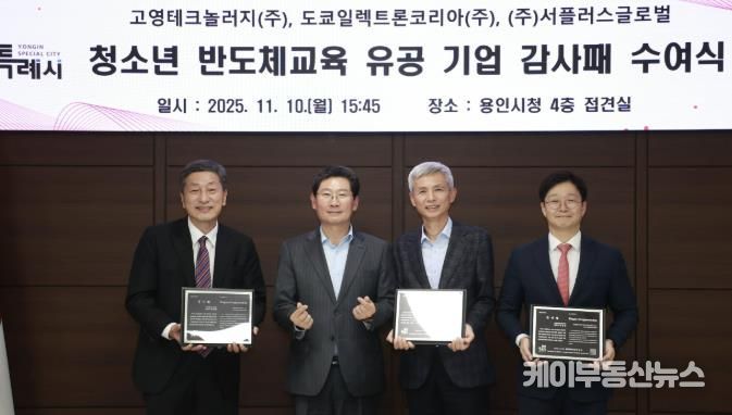 케이부동산뉴스 김교민 기자 | 용인특례시는 10일 시청 접견실에서 ㈜서플러스글로벌과 업무협약(MOU)을 체결하고, 지역 청소년 반도체 교육에 기여한 기업 3곳에 감사패를 수여했다고 11일 밝혔다.