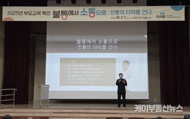 케이부동산뉴스 김교민 기자 | 안산시는 단원구청 단원홀에서 ‘불통에서 소통으로: 진통의 다리를 건너’를 주제로 부모교육 특강을 진행했다고 11일 밝혔다.