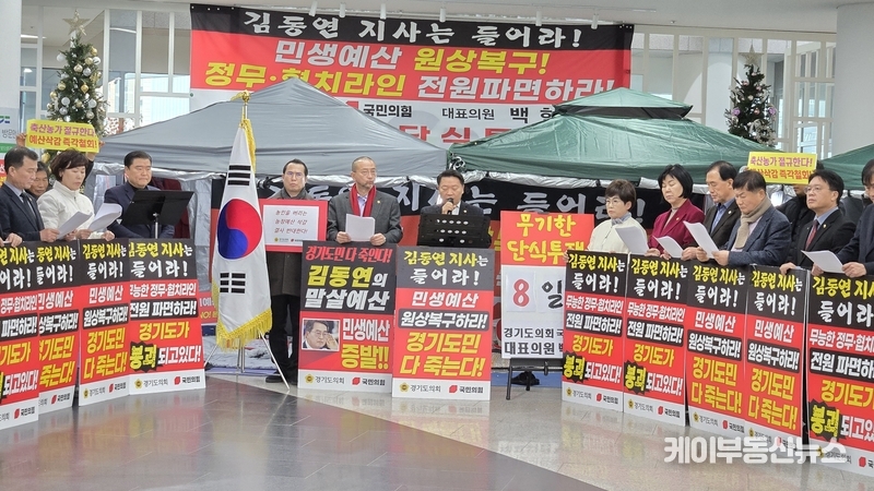 경기도의회 미래과학협력위원회(위원장 이제영, (성남8)와 농정해양위원회(위원장 방선환, 성남5) 소속 국민의힘 의원들은 2일 단식 농성장이 마련된 경기도청 로비에서 기자회견을 열고 김동연 지사의 예산 편성을 정면 비판했다.
