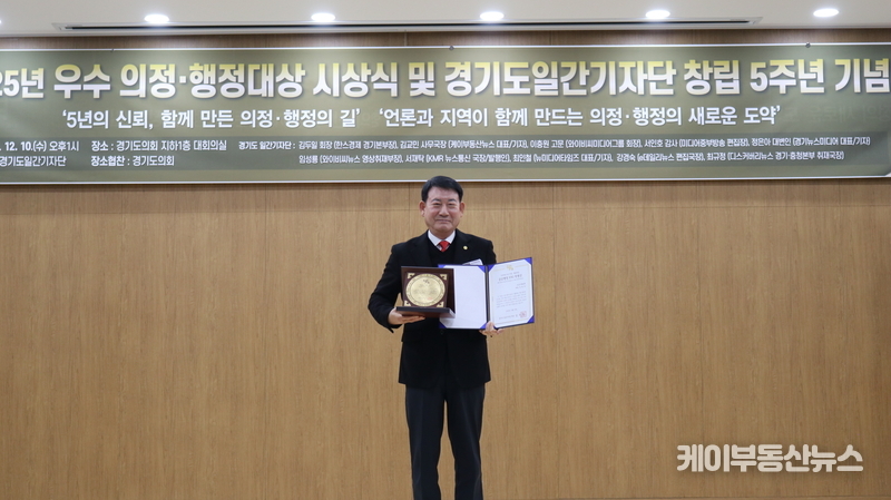 한편, 경기도일간기자단이 주관한 ‘2025 우수 의정·행정대상 시상식’은 외부 전문가 심사위원단 참여를 통해 심사의 신뢰도를 높이며, 도내 우수 의정·행정·공공기관 성과를 공정하게 조명하는 자리로 평가받고 있다.