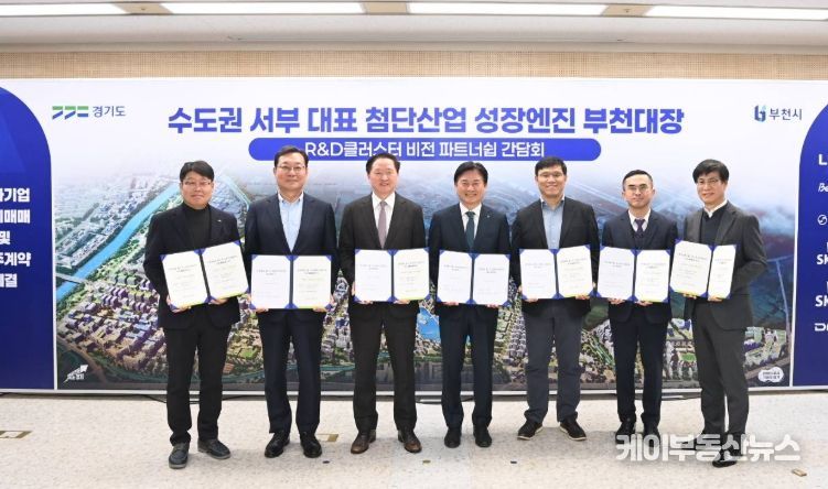케이부동산뉴스 김교민 기자 | 부천시는 15일 오정구청 대회의실에서 대한항공, SK이노베이션, SK하이닉스, DN솔루션즈 등 4개 기업과 ‘부천대장 R&D 클러스터 비전 파트너쉽 간담회’를 갖고, ‘부천대장 도시첨단산업단지 입주 계약’을 체결했다. 이날 4개 기업은 한국주택토지공사(LH)와 4천1백억 원 규모 토지매매계약도 함께 완료했다.