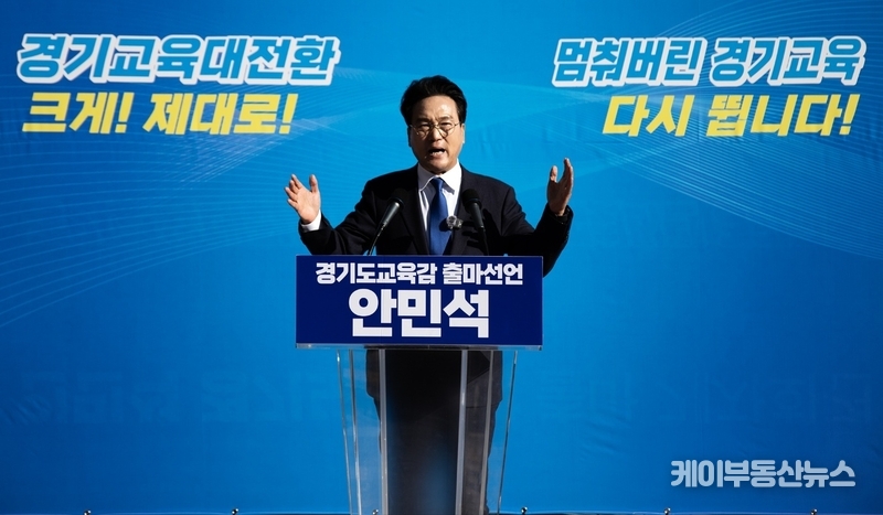 케이부동산뉴스 김교민 기자 | 안민석 전 국회의원이 22일 오전 11시, 경기도 수원시 경기도교육청 정문 앞에서 기자회견을 열고 경기도교육감 선거 출마를 공식 선언했다. 안 전 의원은 이날 ‘경기교육 대전환’을 핵심 비전으로 제시하며, 미래교육·교육격차 해소·학생 안전·교권 보호·교육자치 강화를 아우르는 12가지 교육 공약을 발표했다.