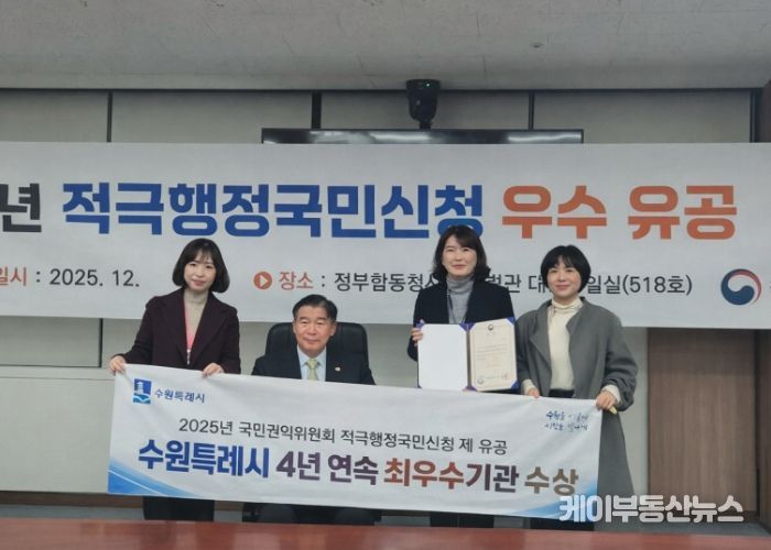 케이부동산뉴스 김교민 기자 | 수원특례시가 4년 연속 ‘국민권익위원회 적극행정국민신청제’ 우수기관으로 선정됐다.