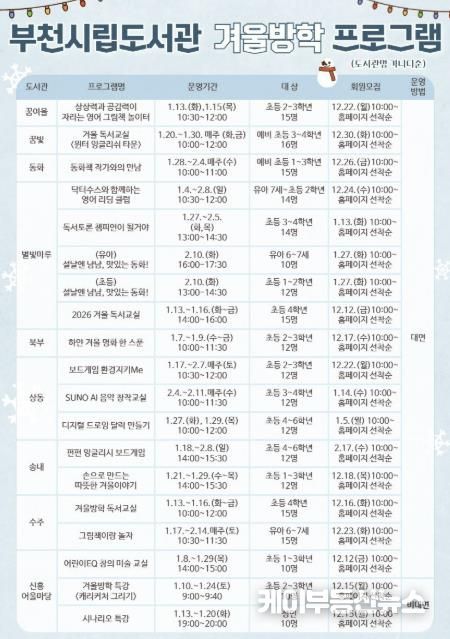 케이부동산뉴스 김교민 기자 | 부천시는 겨울방학을 맞아 내년 1월부터 2월까지 부천시립도서관에서 전 연령을 대상으로 독서문화 프로그램과 행사를 운영한다고 30일 밝혔다. 이번 프로그램은 연령과 관심사에 따라 다양한 참여 기회를 제공하기 위해 마련됐다.