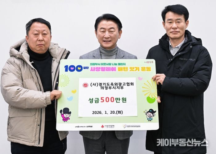 케이부동산뉴스 김교민 기자 | 의정부시는 1월 20일 (사)경기도옥외광고협회 의정부시지부가 ‘100일간 사랑릴레이 배턴 잇기’에 동참해 성금 500만 원을 기탁했다고 밝혔다.
