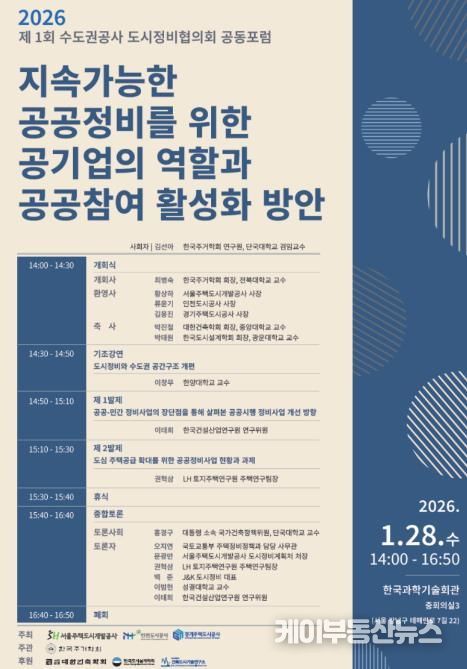 케이부동산뉴스 김교민 기자 | 경기주택도시공사(GH)는 1월 28일 서울 강남구 한국과학기술회관에서 서울주택도시개발공사(SH), 인천도시공사(iH)와 공동으로 ‘수도권 공사 도시정비협의회 공동포럼’을 개최한다고 27일 밝혔다.