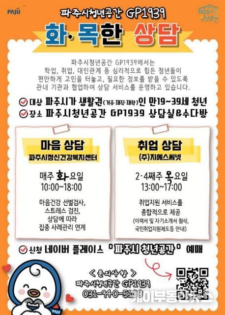케이부동산뉴스 김교민 기자 | 파주시는 청년들의 심리 안정과 취업 역량 강화를 위해 파주시청년공간 지피(GP)1939에서 진행하는 상담 프로그램 ‘화·목한 상담’의 참여자를 모집한다.