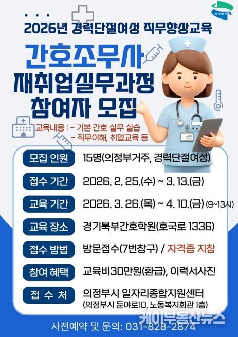케이부동산뉴스 김교민 기자 | 의정부시는 관내 경력단절여성 구직자를 위한 맞춤형 직업교육으로 ‘간호조무사 재취업 실무과정’ 참여자를 모집한다.