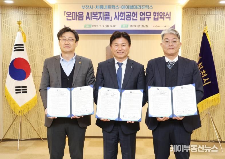 케이부동산뉴스 김교민 기자 | 부천시는 지난 9일 시청 만남실에서 세종네트웍스와 에이블테라퓨틱스와 함께 ‘온마음 AI복지콜’ 사회공헌 업무 협약을 체결했다.
