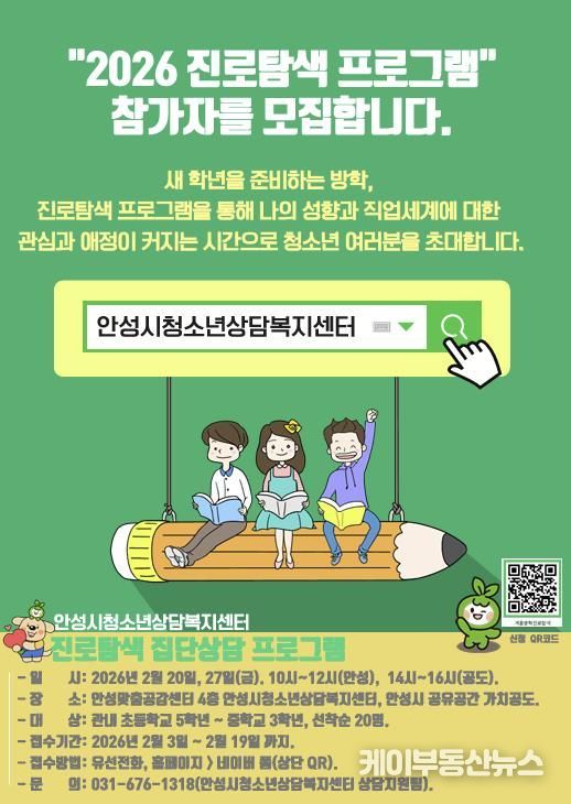 케이부동산뉴스 김교민 기자 | 안성시청소년상담복지센터는 오는 2월 20일과 27일, 2일간 청소년을 대상으로 ‘겨울방학 프로그램 – 진로탐색’을 운영한다고 밝혔다.