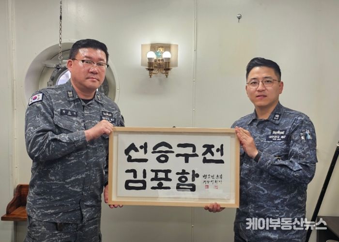 케이부동산뉴스 김교민 기자 | 김포시가 친선결연을 맺고 있는 해군 김포함 신임 함장(함장 이준일) 취임을 계기로, 지역 예술인의 친필 서예로 제작한 함표어를 전달하며 김포시와 김포함 간 유대 강화를 위한 교류를 이어갔다.