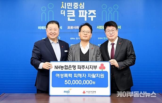 케이부동산뉴스 김교민 기자 | 파주시는 지난 11일 엔에이치(NH)농협은행 파주시지부가 여성폭력 피해자의 자립과 회복을 지원하기 위한 후원금 5천만 원을 기탁했다고 밝혔다.