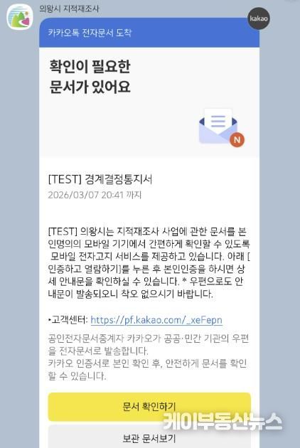 케이부동산뉴스 김교민 기자 | 의왕시가 지적재조사 통지서를 스마트폰으로 발송하는 ‘모바일 전자고지 시스템’을 본격적으로 시행한다.