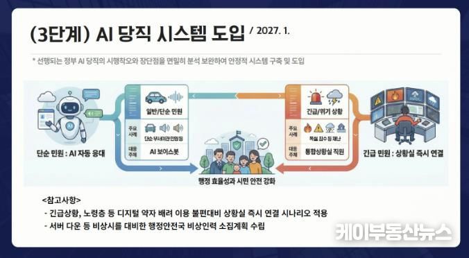 케이부동산뉴스 김교민 기자 | 부천시는 인사혁신처의 공무원 당직제도 전면 개편 흐름에 발맞춰 ‘올인원(All-in-One) 인공지능(AI) 스마트 당직 시스템’을 오는 7월부터 단계적으로 도입한다고 밝혔다. 단순 민원은 AI가 자동 응대하고, 재난 등 긴급 상황은 통합상황실이 통합 관리하는 체계로, 행정 효율과 시민 안전을 동시에 높이는 혁신 모델이다.