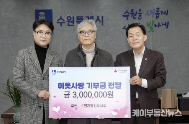이웃돕기성금 300만 원은 수원지역건축사회 회원 137명이 모금해 마련했다. 수원지역건축사회는 2024년에도 이웃돕기성금 300만 원을 기부한 바 있다.