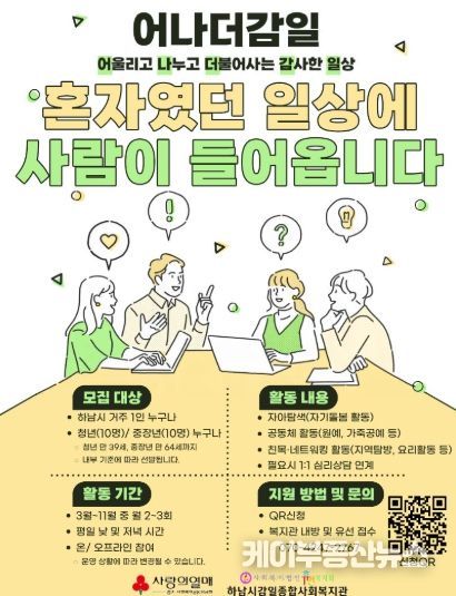 케이부동산뉴스 김교민 기자 | 하남시감일종합사회복지관(사회복지법인 휴먼복지회 운영)은 2026년 1월부터 12월까지 1인 가구의 사회적 관계망 형성과 지역사회 참여 확대를 위한 특화사업 '어나더 감일(어울리고 나누고 더불어사는 감사한 일상)'을 운영하며 이에 참여할 대상자를 모집한다.