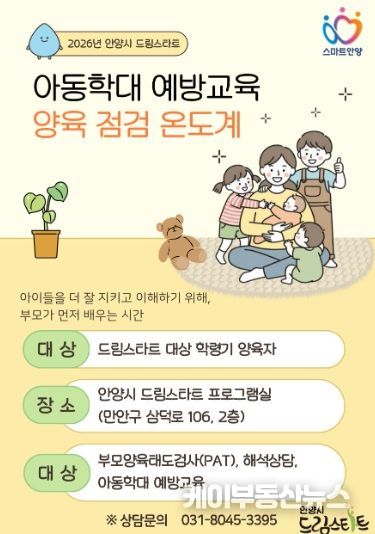 케이부동산뉴스 김교민 기자 | 안양시가 아동 학대를 사전에 차단하고 건강한 양육 환경을 조성하기 위해 맞춤형 부모 교육 프로그램인 ‘2026 드림스타트 양육 점검 온도계’를 본격 가동한다고 18일 밝혔다.