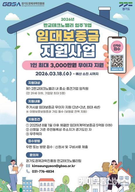 ‘2026년 판교테크노밸리 입주기업 임대보증금 지원사업’은 제1·2판교테크노밸리 입주 중소·중견기업 재직자를 대상으로 최대 3천만 원의 임대보증금을 최장 4년간 무이자로 지원한다.
