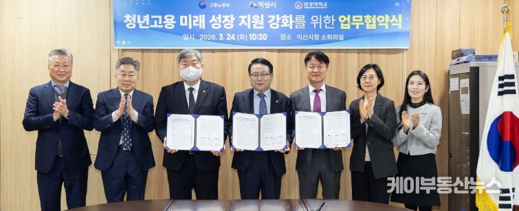 익산시는 고용노동부 익산지청, 원광대학교와 함께 24일 시청에서 '청년고용 미래 성장 지원 강화를 위한 업무협약'을 체결했다.