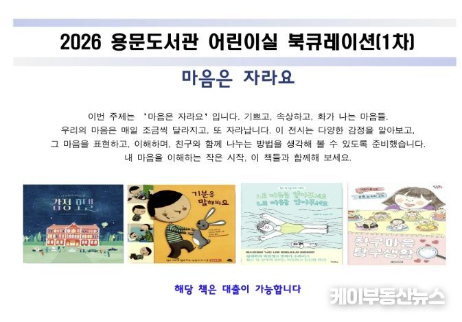 케이부동산뉴스 김교민 기자 | 양평군은 오는 4월 1일부터 5월 31일까지 용문도서관 어린이자료실에서 ‘마음은 자라요’를 주제로 한 도서 추천 서비스(북 큐레이션)를 운영한다고 밝혔다.