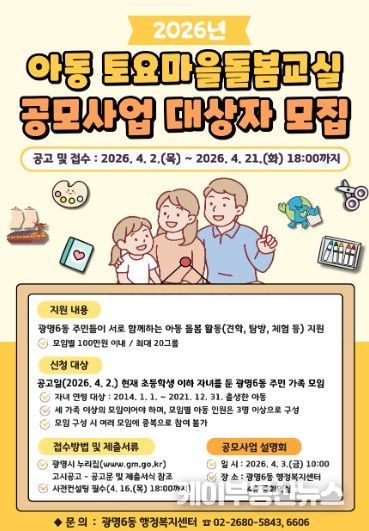 케이부동산뉴스 김교민 기자 | 광명시 광명6동 행정복지센터는 오는 21일까지 ‘2026년 아동 토요마을돌봄교실 공모사업’에 참여할 주민 가족 모임 20개 팀을 모집한다.