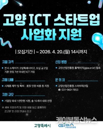 케이부동산뉴스 김교민 기자 | 고양산업진흥원이 ‘2026년 고양 ICT 스타트업 사업화 지원사업’ 참여 기업을 모집한다.