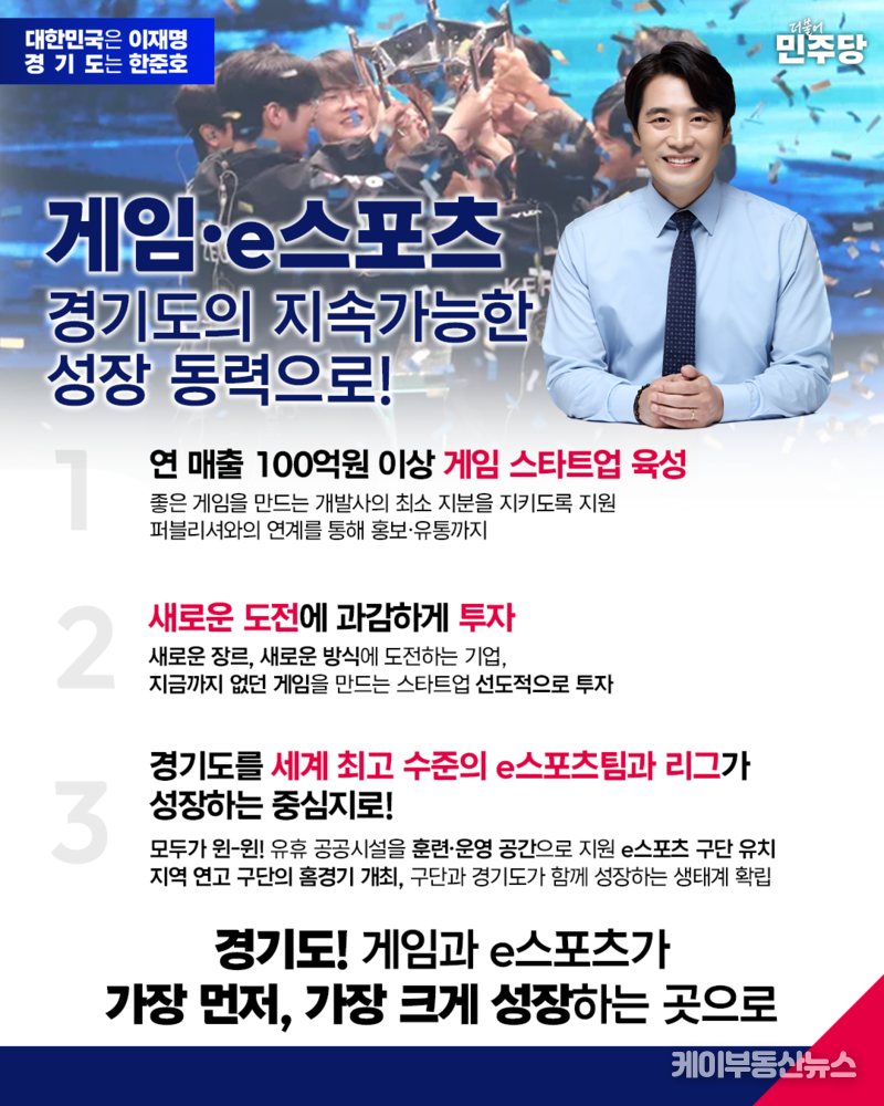 케이부동산뉴스 김교민 기자 | 더불어민주당 한준호 경기도지사 경선후보가 게임·e스포츠 산업을 경기도 미래 성장의 핵심 축으로 전면에 내세우며 ‘판교 글로벌 게임 허브’ 구상을 공식화했다.