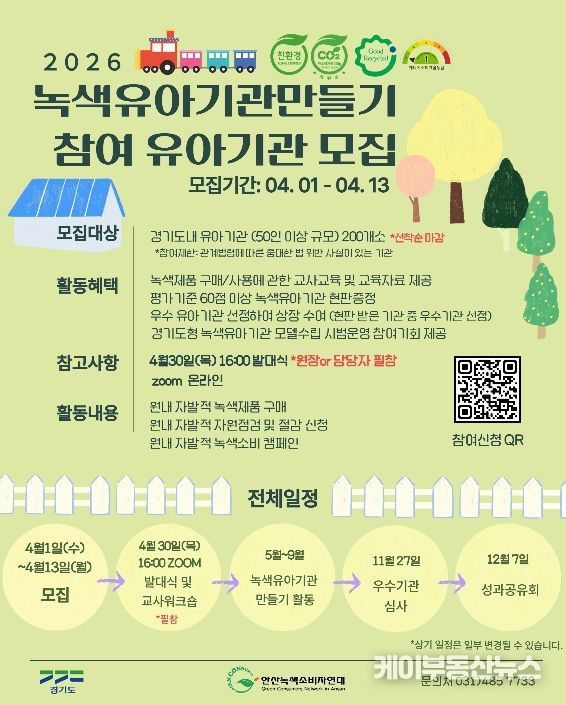 케이부동산뉴스 김교민 기자 | 경기도가 아이들이 생활 속에서 올바른 녹색 소비 습관을 가질 수 있도록 돕는 ‘2026년 녹색유아기관만들기’ 참여 기관 200곳을 4월 13일까지 모집한다.