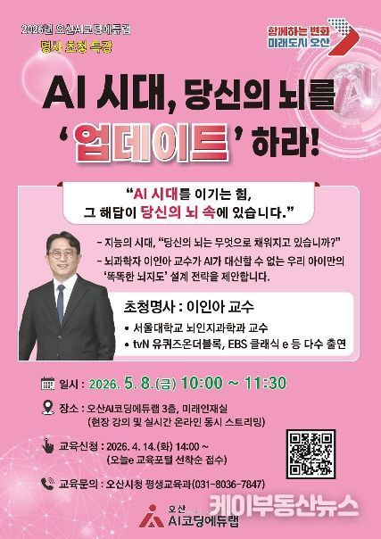케이부동산뉴스 김교민 기자 | 오산시는 오는 5월 8일 오전 10시 오산AI코딩에듀랩에서 『AI시대, 당신의 뇌를 ‘업데이트’하라!』를 주제로 명사 초청 디지털 AI 시민 특강을 개최한다고 밝혔다.