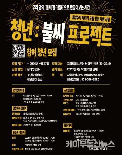 케이부동산뉴스 김교민 기자 | 남양주시는 13일 사회적 고립 청년의 일상 회복과 관계 형성을 지원하는 ‘청년:불씨 프로젝트’ 참여자를 오는 27일까지 모집한다고 밝혔다.