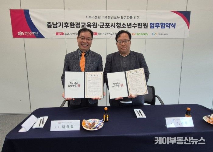 케이부동산뉴스 김교민 기자 | (재)군포시청소년재단이 운영하는 군포시청소년수련원(충남 청양)과 충남기후환경교육원(충남 청양)은 4월 9일, 미래세대의 지속가능 기후환경교육 활성화를 위한 업무협약을 체결했다고 전했다.