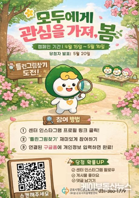 군포시정신건강복지센터 부설 군포시자살예방센터는 자살고위험시기를 맞아 시민 참여형 온라인 캠페인 “모두에게 관심을 가져, 봄”을 오는 4월 15일부터 5월 15일까지 운영한다고 밝혔다.