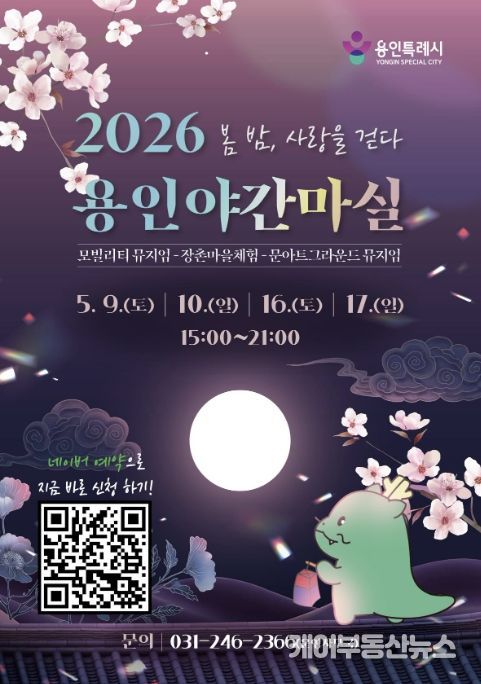 케이부동산뉴스 김교민 기자 | 용인특례시는 5월 14일까지 용인의 아름다운 야경을 즐길 수 있는 체험형 관광 프로그램 ‘2026 용인 야간 마실’ 참가자를 모집한다고 15일 밝혔다.