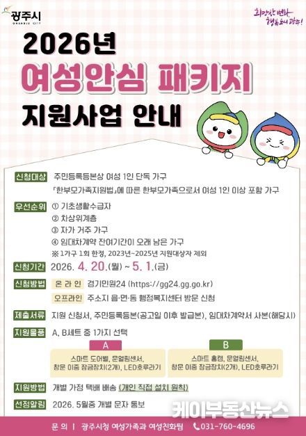 케이부동산뉴스 김교민 기자 | 광주시는 여성 1인 가구와 한부모가족의 생활 안전 강화를 위해 ‘여성 안심 종합 지원사업’ 대상자 35가구를 오는 20일부터 5월 1일까지 모집한다고 17일 밝혔다.