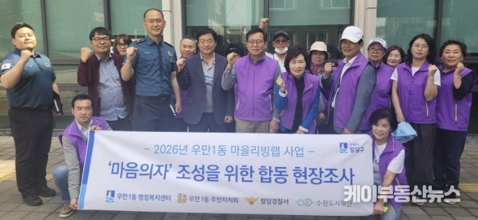 케이부동산뉴스 김교민 기자 | 수원시 팔달구 우만1동은 지난 15일, 보행 약자를 위한 '1분쉼표 마음의자 조성 사업' 설치 대상지 선정을 위해 관내 횡단보도 그늘막 설치구간에 대한 합동 현장조사를 실시했다.