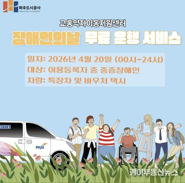 케이부동산뉴스 김교민 기자 | 파주도시공사 교통약자이동지원센터에서는 오는 4월 20일 장애인의 날을 맞아 교통약자를 위한 무료 운행 서비스를 실시한다.